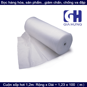 Cuộn có chiều rộng 1m2 chiều dài 100m được cuộn tròn trong bao nilon, đường kính khi cuộn tròn 100m là 60cm, trọng lượng loại thông thườnglà 6,5-7kg, chúng tôi có thể sản xuất cho những đơn hàng đặc biệt cần loại cuộn chất lượng cao hơn, bóng khí tốt hơn, không bị sẹt bọp với cuộn xốp khí 1m2 dài 100m trọng lượng 8, 9, 10kg/ cuộn