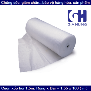 Cuộn xốp có khổ rộng 1m5, chiều dài 100m cuộn tròn trong bao nilon đóng kín có đường kính 60cm, trọng lượng loại cuộn phổ biến trên thị trường là 8-8,5kg, với nhưng đơn hàng yêu cầu cao chúng tôi có thể sản xuất theo yêu cầu, tăng trọng lượng cuộn nên 9kg,10kg,11kg,12kg đảm bảo bóng khí căng đều không bị xẹp khí khi bóp mạnh
