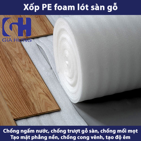 Như vậy xốp lót sàn gỗ là Màng xốp PE foam, hay còn gọi là Mút xốp PE foam, Xốp Foam....